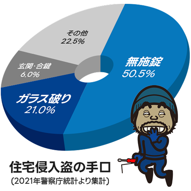 警察庁の統計によると、侵入窃盗の認知件数の3割以上が住人の在宅中に発生した犯行です。